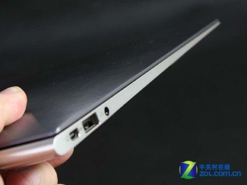 接口方面,华硕UX21笔记本的主要接口都集中在靠近转轴的机身两侧,其中左侧排布有Mini VGA接口、USB2.0接口和耳机接口,而右侧安排有Mini HDMI接口、USB3.0接口和DC IN电源接口。此外,这款笔记本还随机提供了该机专用的USB RJ-45以太网转接器和Mini VGA转接器以方便用户使用。
