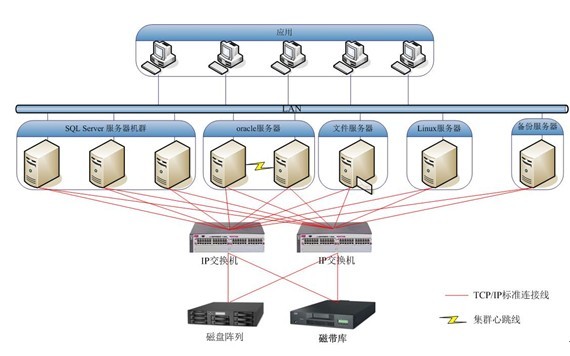 中科同向(www.heartsOne.net)充分考虑其数据安全性的同时,考虑其网络的稳定性。所以采用D2D2T,即从服务器备份到磁盘阵列做近线存储,再归档到物理带库做离线保存的方式,并结合LAN-FREE的模式,实现高可用,高速传输的数据容灾方案。