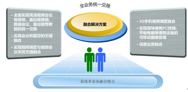 该系统由“多媒体业务融合通讯平台”、“综合视频接入平台”、“综合语音接入平台”组成服务端设备;由“双向应急指挥通讯终端”、“指挥中心全业务一体化触控调度台”、“智能双向移动指挥调度终端”、“智能单兵移动摄录终端”构成终端设备;系统以实现全系统分布式调度、实时参加应急多媒体会议、固定及移动视频监控、指挥中心与现场语音调度通信、实时录播、联动与对接为主要特点。