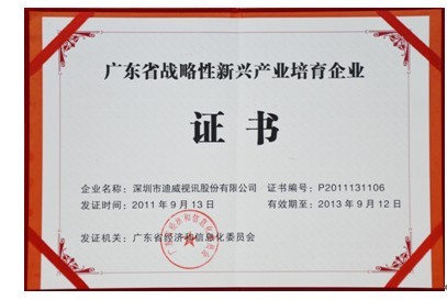 为落实广东省省委省政府培育和发展战略性新兴产业的战略部署,经自愿申报、资格审查、初评、专家评审、现场考察等环节,迪威视讯公司获“广东省战略性新兴产业培育企业”称号。 广东省战略性新兴产业培育企业评选是以企业自主创新能力强、主业突出、掌握核心关键技术、拥有自主知识产权和品牌优势、产品市场率及主要经济指标居国内领先等为基本标准,并要求其能对社会经济全局和长远发展具有重大引领带动作用,且物质资源消耗少、成长潜力大、综合效益好。此次评选是对一个企业全方位、综合的考量。