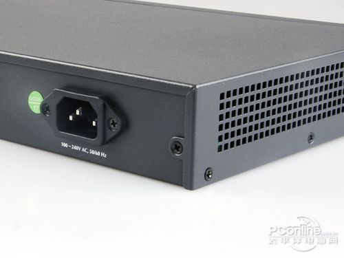 侧面是散热孔和用以安装在机柜的螺丝孔,电源插口在背部,磊科NR266-E内置100-240V宽幅电源稳压,即使在用电高峰导致电压偏低时也能正常工作,确保出租屋网络的稳定性。