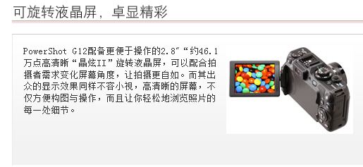 | 佳能(Canon) PowerShot G12 数码相机 配备了独具魅力的2.8"约46.1万点高清晰“晶炫II”旋转液晶屏,不仅屏幕的高分辨率可以清晰再现物体的细节和层次,而且让拍摄更自如。配以28mm广角和5倍光学变焦,以及强化的双重IS防抖功能,可以随心所欲获得出色影像。 |