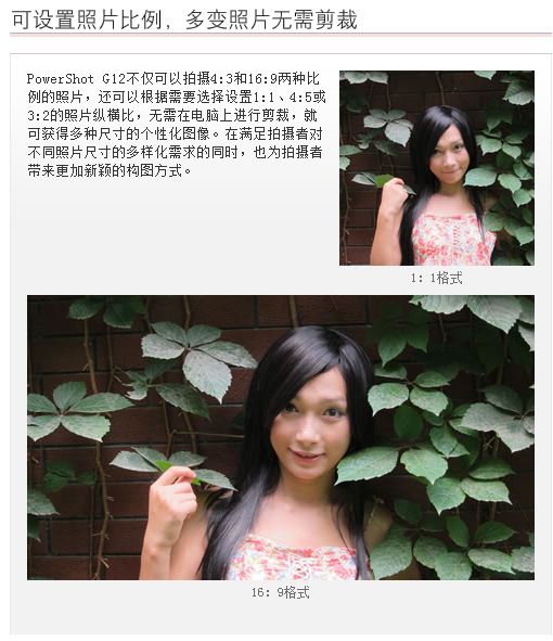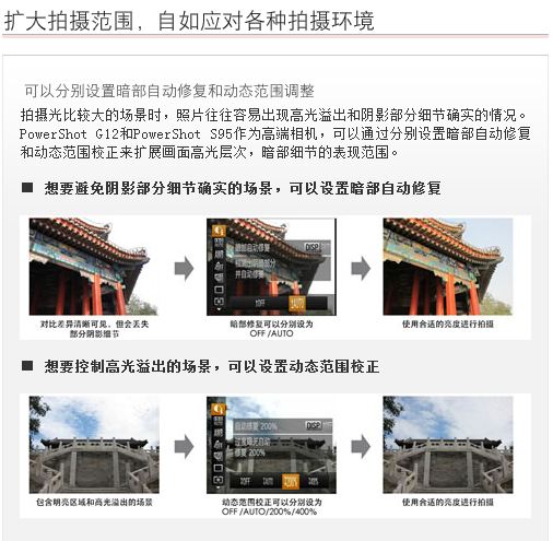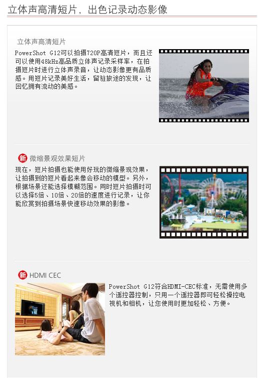 PowerShot G12配置28mm广角和5倍的光学变焦,焦距段涵盖了从广角到中长焦,既可以拍摄宽阔壮观的风景,也可以将远方的美景尽收眼底,此外, PowerShot G12还可以实现1cm的微距拍摄,让你尽情捕捉那些隐藏在细微之处的惊喜。 |