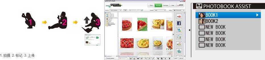 在相机中创建照相簿。轻松访问、便于携带,您可以将图像与家人和朋友随时随地分享。该软件内置在相机中,可让您相应创建保存和组织标记图像的照相簿文件夹。您也可以将相机连接到互联网在线订购冲印照相簿,以及将相机拿到冲洗店打印照片时,图像加上标记后可轻松排列。