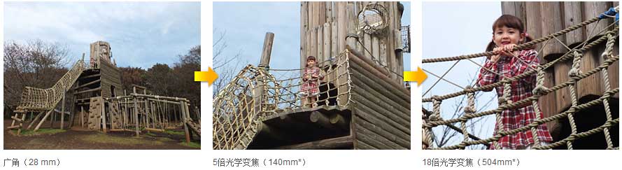 该功能可在标准广角下追踪快速移动的物体,轻松地以高变焦设置取景构图。只需按一下按钮,在LCD显示屏上所选框内被追踪的对象将被拍摄并以高变焦比保存(1.4倍或2.0倍数码变焦)。