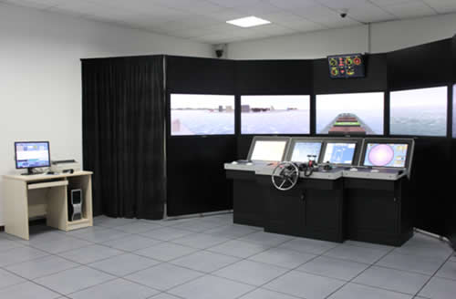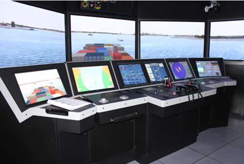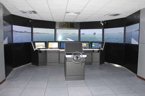 本项目采用7台65寸松下等离子显示器进行航海模拟仿真操作,主要工作原理为:由船舶操纵人员输入舵角和主机转速等信号,计算机采样接收后,按船舶数学模型和环境(风、流、浪、侧壁和浅水效应)数学模型进行实时仿真计算,其输出用于雷达、导航仪表和仿真视景装置,它们共同产生一个同真实海上操纵船舶相仿的内外环境。船长通过对环境的感受,根据操纵船舶的经验,向船舶操纵人员发布命令,完成系统的闭环。被训练人员(船长和船舶操纵人员)在这种闭环系统中受到训练。