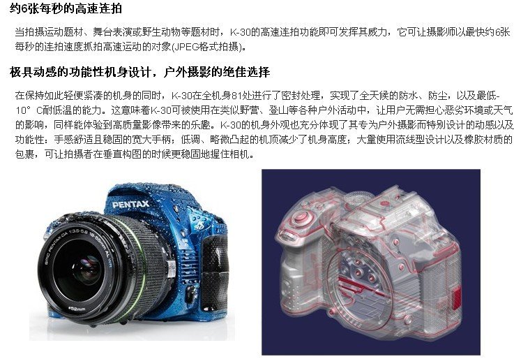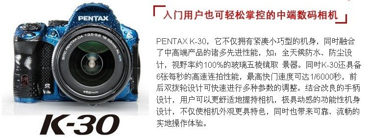 宾得 PENTAX K-30/DAL18-55 F3.5-5.6AL 单反套机(白色)有效像素 约1628万 传感器类型 含原色滤光镜的CMOS 传感器尺寸 23.7 x 15.7 (mm) 分辨率 4928x3264