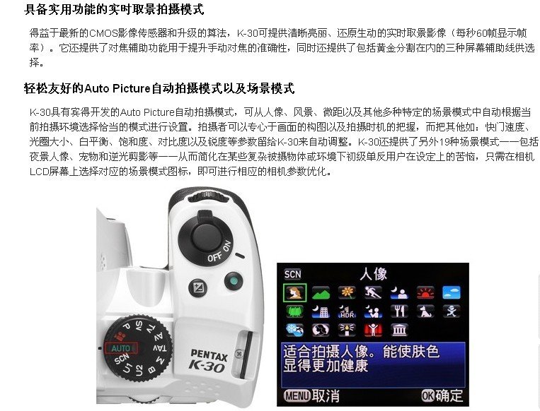 模式 Auto Picture自动拍摄模式:从标准、人像、风景、微距、动体、夜景人像、夜景、蓝天、森林几种模式中自动选择