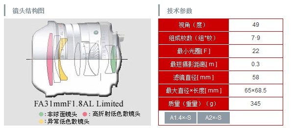 ●焦距31mm 该相机的焦距为31mm,大致在广角镜头的常规产品35mm与28mm之间。其视角独特,可根据不同的绘图方法发挥出各焦距的长处。●高成像性能与丰富的表现力 不仅高水准实现一般广角镜头的成像特性的清晰成像、突出的远近感、被拍摄视角深度等,而且还赋予了丰富的灰阶、暗部的细节再现、自然柔和的离焦成像等“成像品位”。对于由近距离到远距离的连续图像,也可实现清晰平滑的成像。 ●浮动对焦系统 采用浮动对焦系统,同时改变摄影距离,从而改变部分镜头系统的间隔。可在所有摄影距离上较好地纠正各种像差。对于用大口径广角镜头进行近拍时容易产生的弯曲图像,可有效地进行纠正。●其它 1.“Limited系列”共通的具有高档感和精密感的铝合金外观 2.可安装滤镜的镜头前框一体式变形花型遮光罩 3.“finger point”为七宝烧陶瓷材料,提高了安装到相机机身上的易安装性。※如安装在PENTAX数码单反相机上,焦距为47.5mm(相当于35mm胶片格式)。