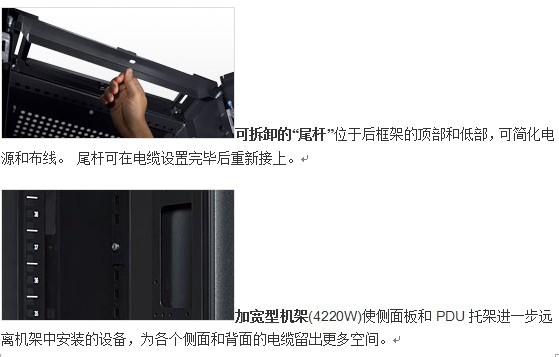 配电:集成式托架可为立式配电装置(PDU)提供免工具安装。