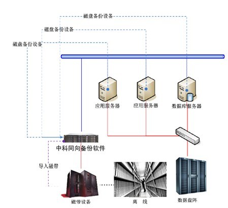中科同向(www.heartsOne.net)充分考虑其数据安全性的同时,考虑其网络的稳定性。所以采用D2D2T,即从服务器备份到磁盘阵列做近线存储,再归档到物理带库做离线保存的方式,实现高可用,高速传输的数据容灾方案。