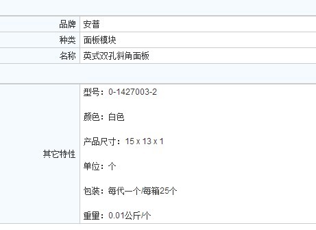 安普(AMP) 英式双孔斜角面板批发价促销仅8元!!价格优惠!!有兴趣的朋友可致电13366587287进行咨询。最好的价格,专业的服务,期待您的来电,联系人张辰生。