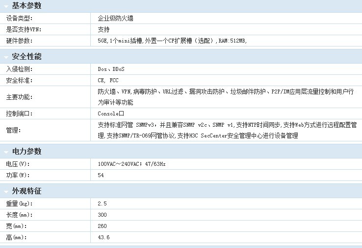Quidway SecPath 100F防火墙是华为3Com公司面向企业用户开发的新一代专业防火墙设备,可以作为中小企业的出口防火墙设备,也可以作为中型企业的内部防火墙设备;支持外部攻击防范、内网安全、流量监控、网页过滤、邮件过滤等功能,能够有效的保证网络的安全;采用ASPF状态检测技术,可对连接过程和有害命令进行监测,并协同ACL完成动态包过滤;提供多种智能分析和管理手段,支持邮件告警,支持多种日志,提供网络管理监控,协助网络管理员完成网络的安全管理;支持AAA、NAT等技术,可以确保在开放的Internet上实现安全的、满足可靠质量要求的网络;支持多种VPN业务,如L2TP VPN、IPSec VPN、GRE VPN、华为动态VPN、SSL VPN等等,可以构建Internet、Intranet、Remote Access等多种形式的VPN;提供基本的路由能力,支持RIP/OSPF路由策略及策略路由;支持丰富的QoS特性,提供流量监管、流量整形及多种队列调度策略。 Quidway SecPath 100F防火墙提供4个固定的10/100M自适应FE口 LAN口和3个固定的10/100M自适应FE口 WAN口。提供一个MIM 扩展槽位,目前可选的接口模块有1FE/2FE/NDECII/HDC四种。提供机箱内部环境温度检测功能,并支持网管,满足高可靠性要求。