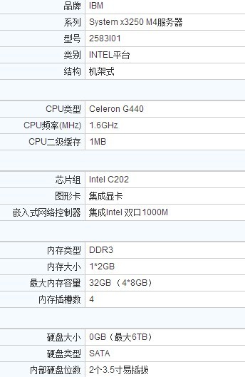 IBM X3250 M4机架式服务器 2583i01(G440 2G 无硬盘/标配2个硬盘位 无光驱 支持软RAID 0,1,10) 4399元