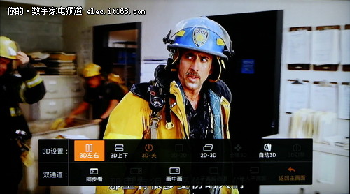 需要说明的是“双通道”功能要分别使用不同的信号源来进行影视播放,比如同时播放移动硬盘和蓝光播放器的不同内容或者观看在线视频和有线电视画面,而在智能界面不能开启这个功能。具体实施方法就是进入文件管理,找到硬盘里的影片,进行播放。当硬盘里的电影播放之后,再通过点击遥控器上的“3D”按键,就会出现3D和双通道功能。