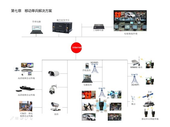 移动单兵智能终端一般作为手持式设备,配合运营商的3G/WIFI/WIMAX/卫星指挥车的基站,实现大范围的无线传输。其应用具备两种工作模式:第一种工作模式是作为移动会议终端使用,实现H.323会议终端;第二种工作模式是作为单兵终端设备,实现图像采集、传输功能,PTT对讲功能和其他一些附加功能。