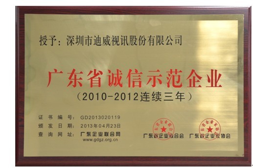 近日,深圳市迪威视讯股份有限公司再次获颁“广东省诚信示范企业”。至此,迪威视讯已经连续三年获得该荣誉。