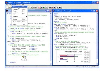 Lingo 提供完全互动的环境供您建立、求解和分析模型。Lingo 也提供 DLL 和 OLE 界面可供使用者由撰写的程序中呼叫。