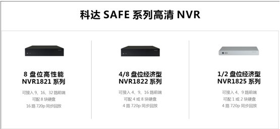 科达此次推出的SAFE系列NVR不仅继承了科达在NVR领域的深厚积累,而且还在开放性、智能检索、易用性等方面取得了进一步的提升。首批发布的产品包括NVR1821、NVR1822、NVR1825三个系列: