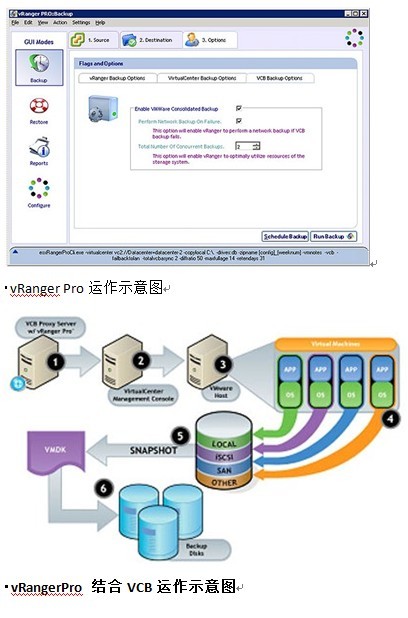 不同与代理程序,vRanger Pro在客户操作系统之外运行,还可以与Vmware Virtual Center共同使用,以便进行有效管理。现在可以支持VCB,且提供Vmotion感知技术,因此它可以随着虚拟机执行日常计划备份,即使该虚拟机已被Vmotion迁移到其他ESX上。