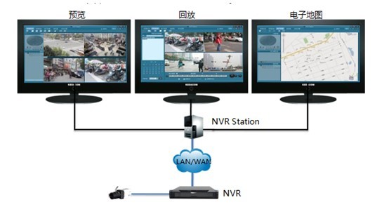 在实际使用过程中,用户可在三个屏幕上同时预览操作,也可任选一屏录像回放或任选一屏显示电子地图。在电子地图上还支持报警联动应用,当某个监控点发生告警时,电子地图可在对应位置弹出图像预览窗口发出提示,点击后可显示大画面监控视频。