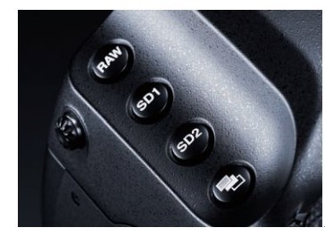 双SD/SDHC储存卡插槽——让照片的管理更有效率的图像记录方式 645D的记录格式可以在RAW和JPEG中选择,也可同时保存两种格式。按一下RAW按钮,即可切换记录模式。此外,645D还装备有两个SD/SDHC储存卡插槽(SD1/SD2)。各记录模式以及使用模式(备份模式、分别存储模式、RESERVE模式),可直接通过设定按钮简单进行快速设定。