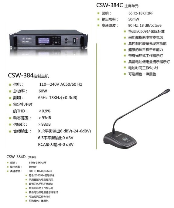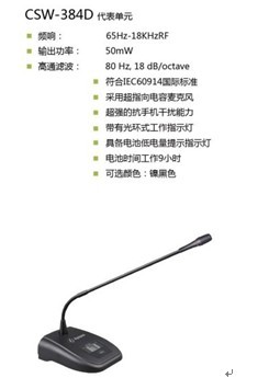 频段传输,高保真的线路设计的操作下,可产生高品质CD的声音效果。系统具有抗干扰保护,能有效地阻隔环境中的电脑设备,移动电话和蓝牙设备的无线设备的影响。独具的安装简易,轻松快速,并对安装场所无任何影响的卓越优势,特别针对历史文化的建筑物的安装或布置,使用者不用担心对古建筑材料造成损坏,不需CSW-384智能无线会议系统的操作在军用安全级别AESofdig专用保密技术协议,2.4GHz布线,也不必钻孔,为苛刻复杂的应用产所提供了专业完美的解决方案。