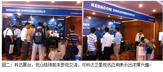 科达本次携卫星视讯整体解决方案参与了展出,并于卫星技术交流论坛上发表了“卫星视讯、沟通无限”的主题演讲,与现场观众共同探讨了卫星视讯的一些新应用,现场获得颇多好评。