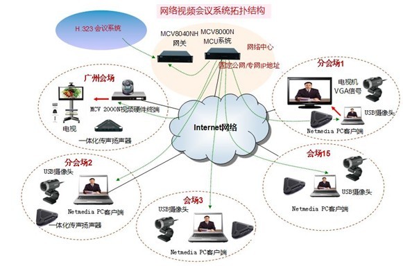 在中国农业银行广州分中心机房部署1套MCV8000N多媒体MCU平台及网关MCV8040NH平台设备, 广州中心会议室部署硬件会议室终端MCV2000NE一套,各分会场部署15套Netmedia PC会议软件客户端。