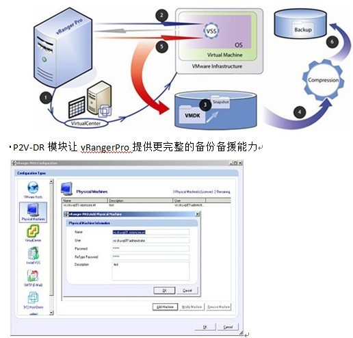 现在,vRanger Pro提供一种全新的功能,即P2V灾难回复。它是一种安全可靠的方法,用于获取所有实体windows服务器的映像,无需中断实体服务器,只需几个步骤便可以为来源机器设定备份工作。另外新的VSS机制使用微软的volume shadow copy服务可以让支持的数据库静止,然后提供数据一致性备份映像,以便降低数据丢失的风险。