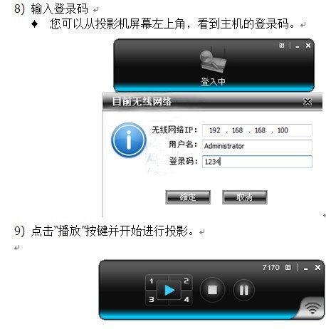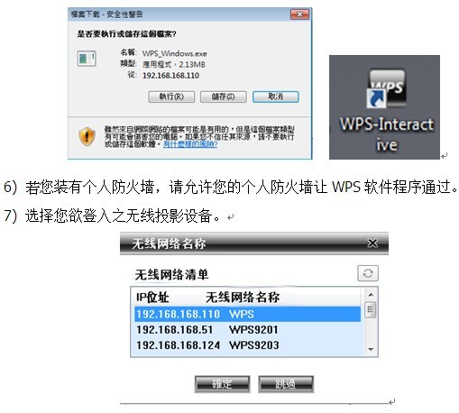 ¨ WPS 预设网址为192.168.100.10,或者參考出现在投影画面的左下角的Server IP地址。