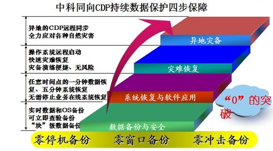 高度的数据备份安全需要做数据持续保护CDP。CDP技术中科同向实现了PTO=0,RPO=0,做到了零数据丢失,保证业务的连续性,在故障期间瞬间恢复数据。中科同向CDP数据保护采用了四步骤,被称为“四金刚”。