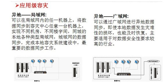 企业应用级容灾DR,对数据库日志进行抓取,分析,保持了同步数据备份容灾。对数据库、文件、系统可以做到实时增量备份,可以设置不同的备份策略,实现了局域网和异地容灾。