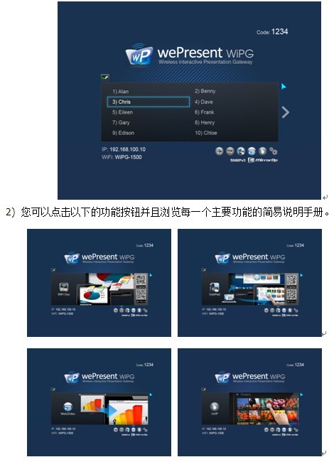 1) 当有使用者登入至WiPG1500装置后将会显示PC-List在待机画面上,而会议主讲者可使用USB 鼠标/键盘/触控屏幕/电子白板去选择使用者PC投影并且同时可以进行远程控制。