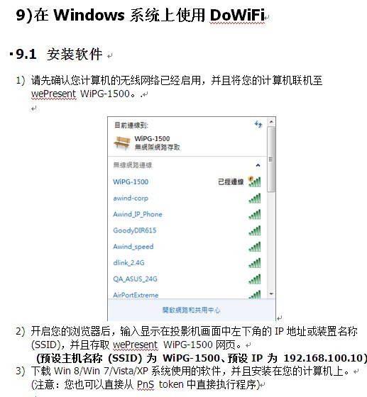 1) WiPG-1500将会搜寻可联机的无线网络并且也会列出WiPG-1500装置。 您可以选择其中一个无线网络并透过“联机”按钮与选择的无线网络装置联机。
