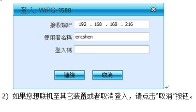 1) 当联机至有“Code”保护的WiPG-1500装置时,您必须输入“Code”后并点击“联机”按钮去登入该装置。 (您可以从待机画面中的右上方找到Code)
