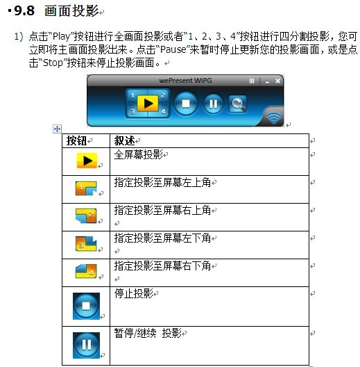 1) 当您进行全画面投影或着投影至四分割1画面时,您可以选择投影声音至WiPG-1500装置并进行多媒体或影片播放。