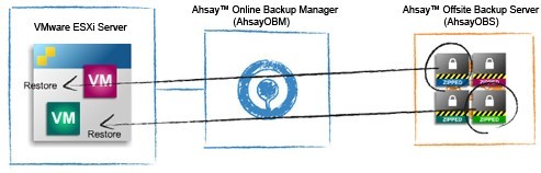 AhsayOBM 全功能的客户端备份程式具备了 VMware 备份模组,可将 VMware ESX、ESXi、Server、Workstation、Fusion 及 Player 内的独立虚拟机器备份到 AhsayOBS 上。如需备份 ESX 或 ESXi,你需要将 AhsayOBM 安装於一台和 ESX 或 ESXi 处於相同网络上的电脑上;如要备份 Server、Workstation、Fusion 及 Player,则只需要将 AhsayOBM 安装於这些物理机器之上即可。 备份方法非常简单 每次备份时,AhsayOBM 便会先为需要备份的虚拟机器拍摄快照,然後将上次备份之後的增量部份抽出进行加密及压缩,然後备份到 AhsayOBS。