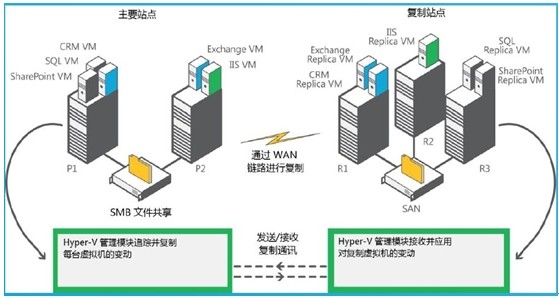 1、?Hyper-V 副本:在两个站点中的存储系统、群集以及数据中心之间,复制虚拟机,以此来实现业务连续性,并在短时间内完成灾难恢复