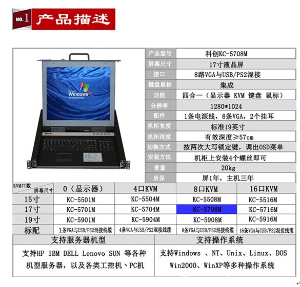 Introduction ??整合显示器/Touchpad鼠标/104带数字区键盘/电子切换器?卓越的视频效果,最佳分辨率可达1280*1024 75HZ?支持完整的DDC2B功能,未切换计算机也能侦测屏幕型号?双界面PS/2 /USB键盘鼠标切换器连接控制电脑?抽拉式安装设计,可以调整长度以适应各机柜空间?人性化设计,一人可安装与拆卸,提高管理员工作效率?键盘热键或OSD进行电脑选择 ,最多可管理256电脑?密码安全保护,仅有授权的用户可以检视及管理联机的电脑?支持适用机房各品牌服务器和工控机:如IBM、DELL、HP、SUN、Lenovo、advantech 、PONTRON、EVOC等?兼容支持 Microsoft、Linux、Unix等系列操作系统